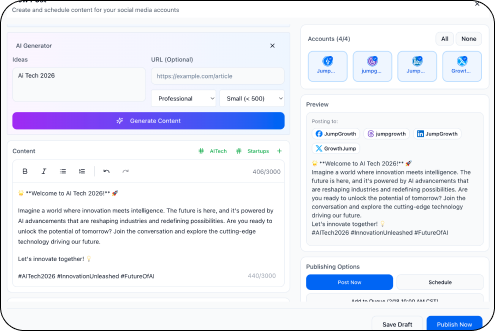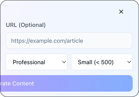 Generate posts directly from articles, blog posts, or web content. AI analyzes the content and creates engaging social media posts.