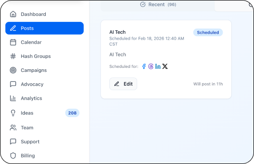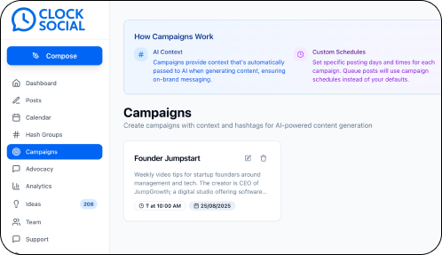 Create themed campaigns with custom posting schedules, AI-generated content with campaign context, and automatic hashtag.