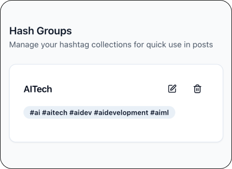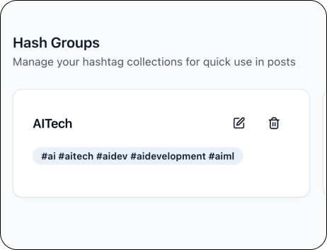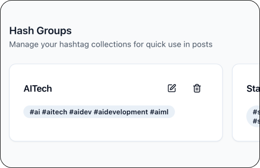 Create reusable hashtag collections for consistent branding. One-click hashtag insertion and ensure brand consistency across all posts.